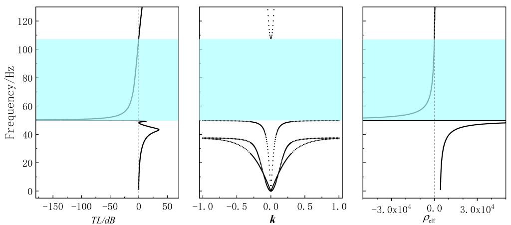 图 2(a)隔振器单胞的能带结构,(b)隔振器在Z轴方向的传输损失及(c)等效质量密度